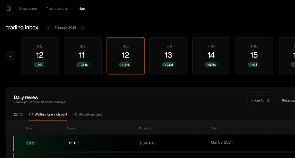 After your trades sync, enrich them while context is fresh. Add strategy tags, emotions, screenshots, and notes in the Inbox. Then review them in table, gallery, or calendar view to start spotting patterns.