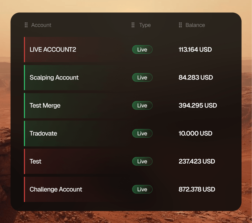 Keeping track of my different accounts and prop challenges was a giant mess until I found this Accounts view that keeps everything organized and honest.